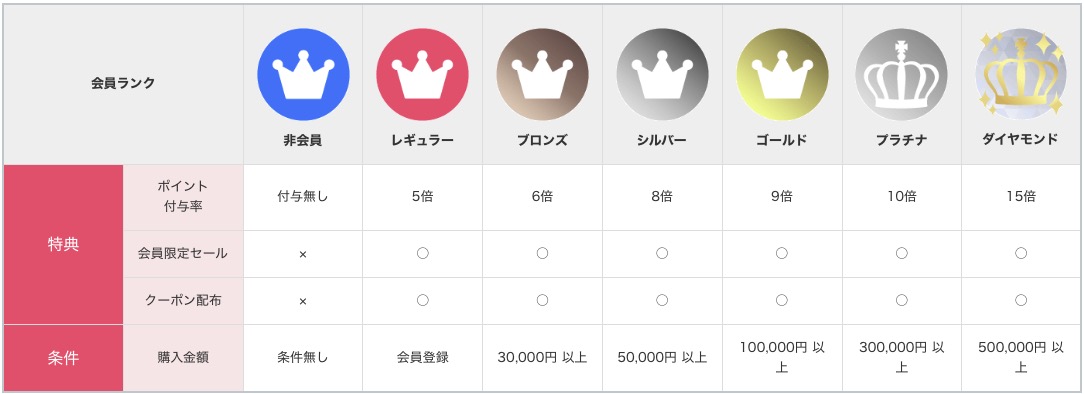 | 還元 | 会員ランクによってポイントは5~15%還元。 |