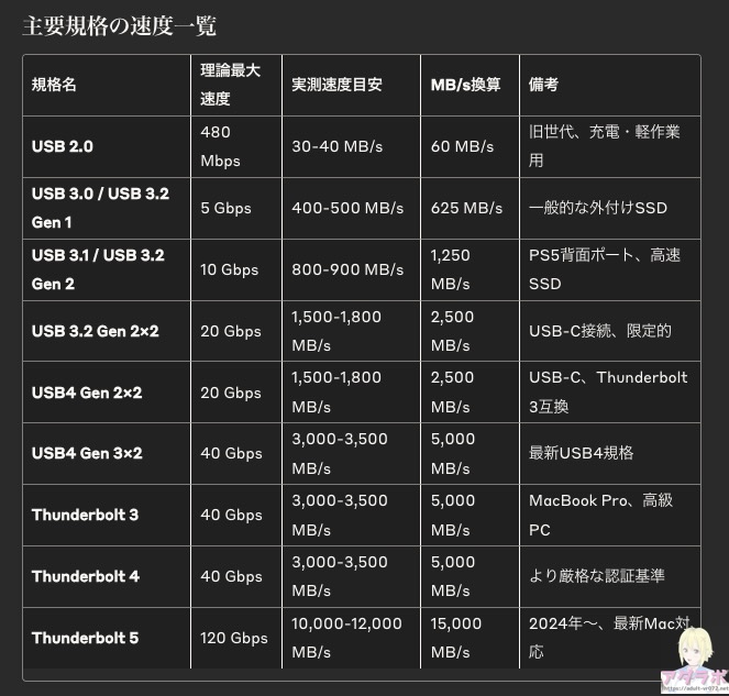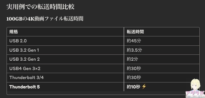 M.2 SSD(M.2 NVMe PCIe 4.0)は上位のものだとおよそ7,000MB/sと高速なので、一般的なUSB 3.2 Gen 2のSSDと比べて7倍ほどの差が出ます。Thunderbolt5対応の最新Macで実力を発揮するでしょう。