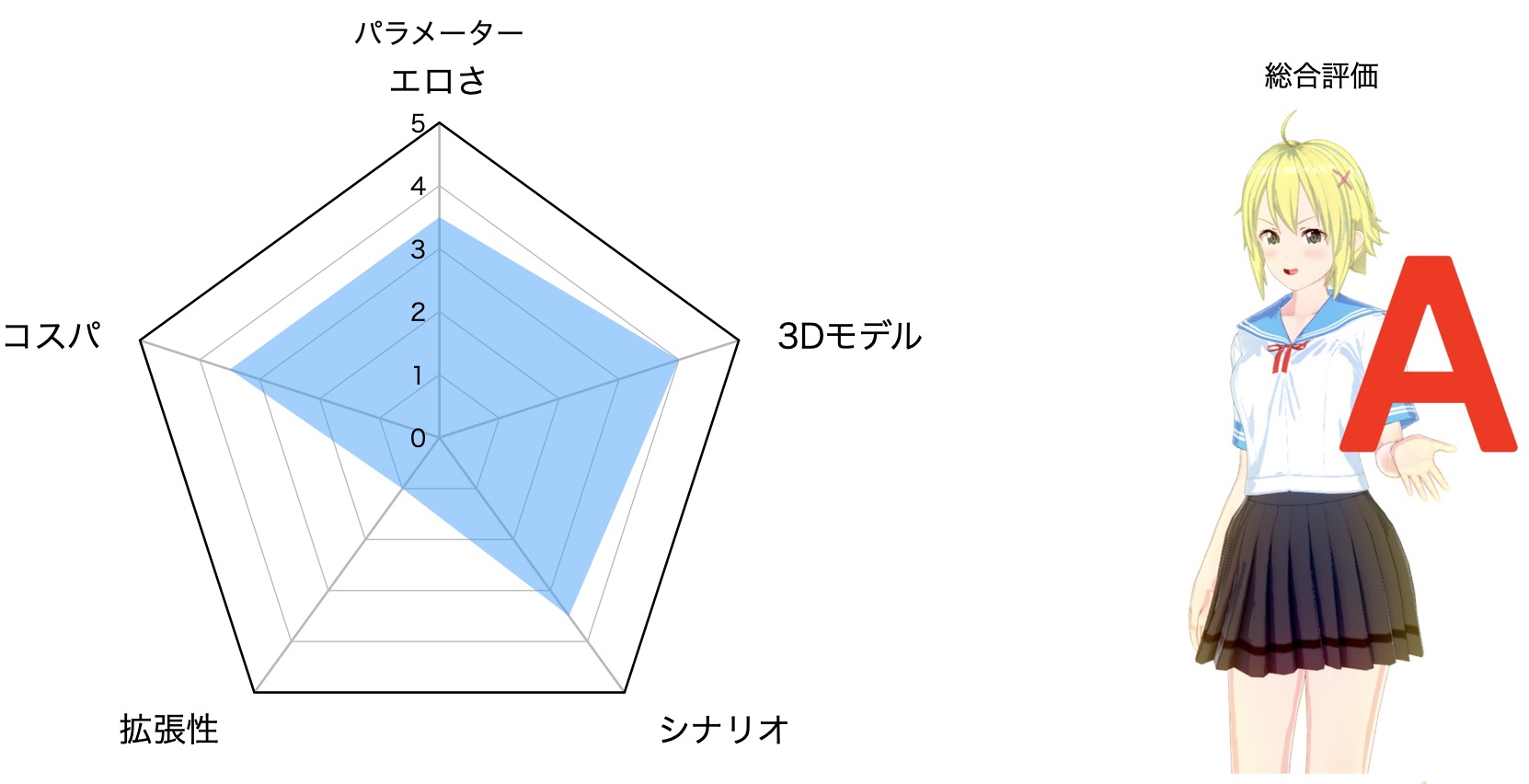 3Dモデル:モデルの綺麗さ・可愛さ。定番VRCモデル級だと大体4.5くらい。