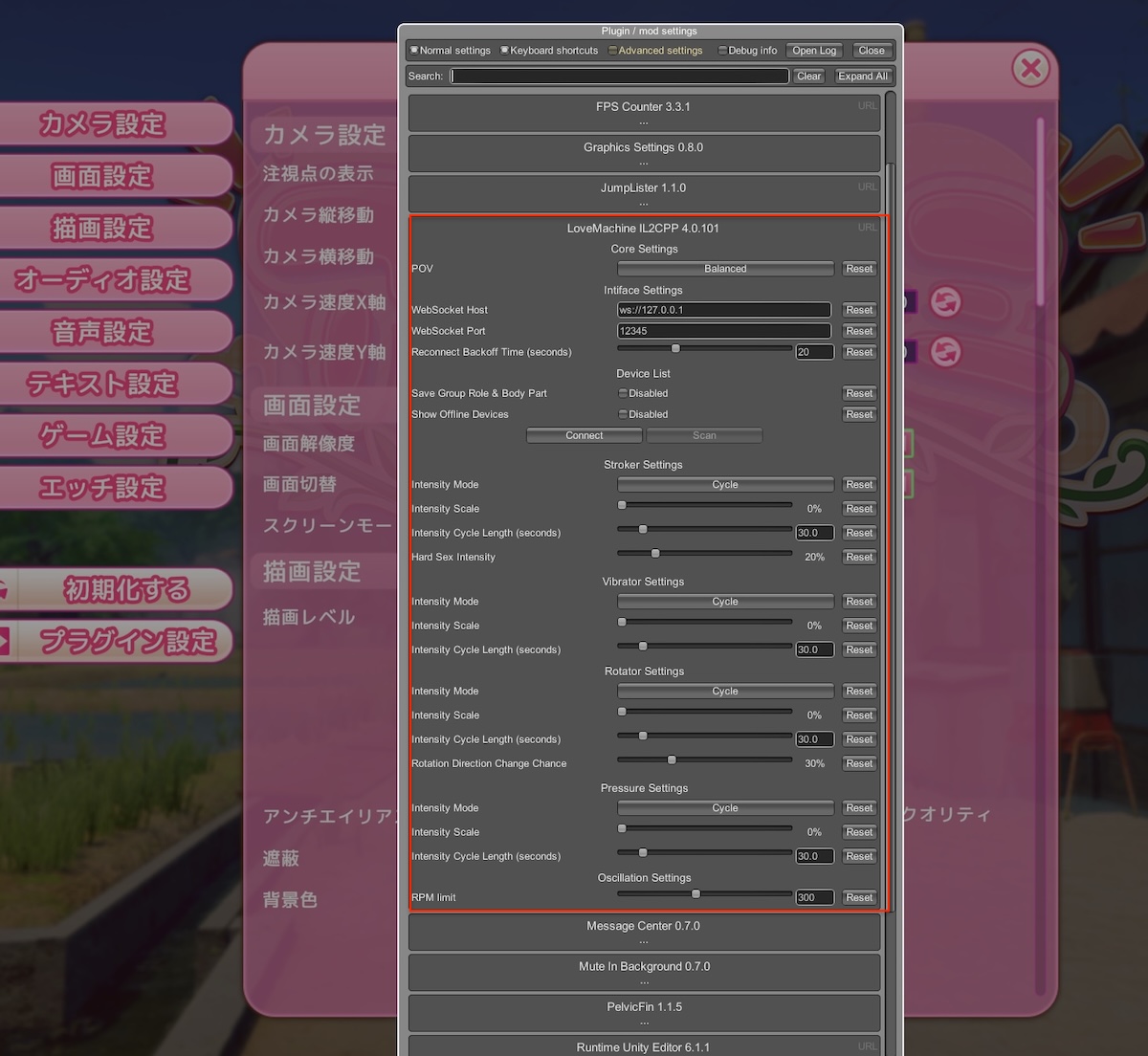 プラグイン設定の方から細かい設定ができますが、Intiface Centralに接続するとエラーでプラグイン設定が開かなくなる問題を確認。ログも真っ赤。何かが悪さしてるかも。