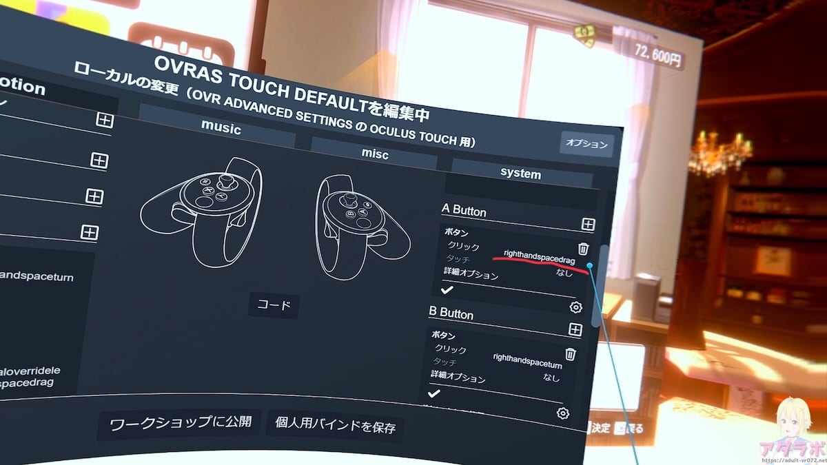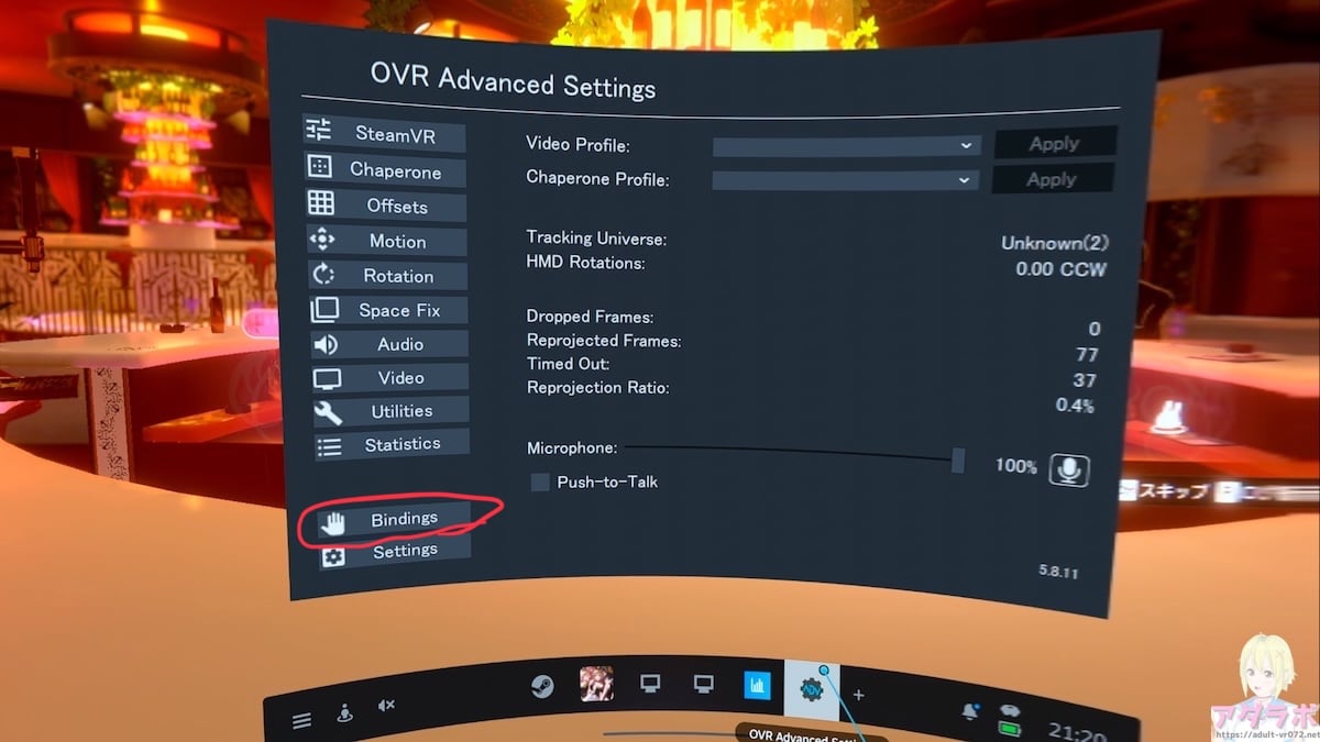 初期状態ののままでは視点が移動できなくて遊びづらい。この問題を解決するために必要なのがSteamの有料外部ツール「OVR Advanced Settings」です。空間を掴んで移動するグリップムーブを追加するならこのツールを買っておくと便利。