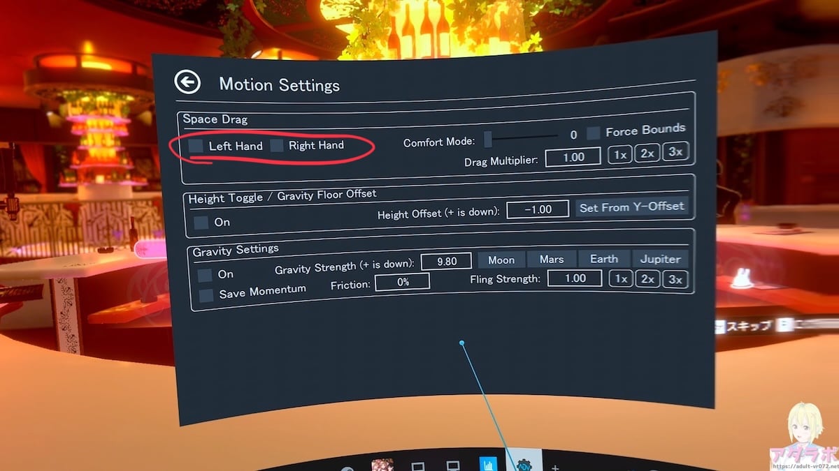 Space Dragの「Left Hand」「Right Hand」のチェックマークをONにします。どちらか片方でいい場合は自分で片方選べばいいのですが、最初は両方チェックしておいた方が無難かもしれません。