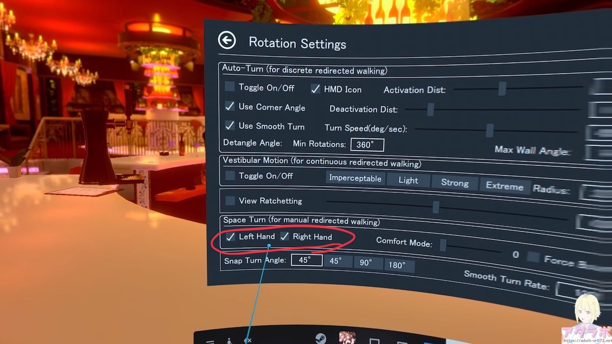 下のSpace Turn(for manual redirected Walking)の項目にある「Left Hand」と「Right Hand」にチェックを入れます。旋回機能はこれだけで追加が完了しました。