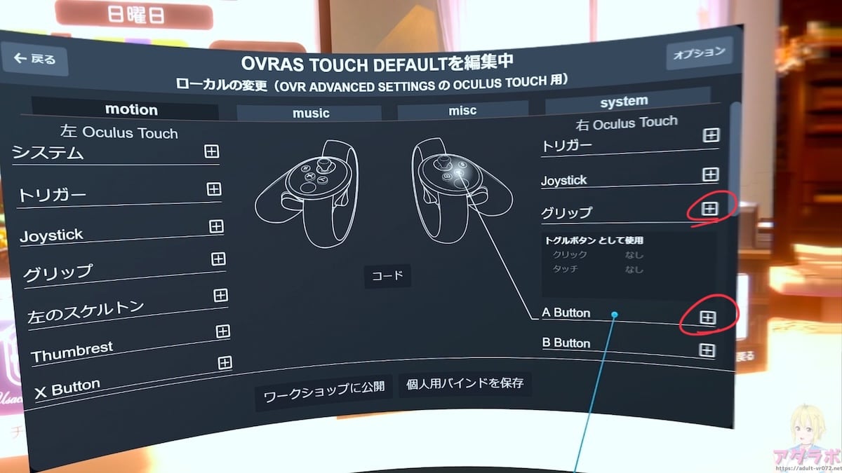 そしたらグリップムーブ(=空間を掴む)の機能を追加したいボタンを選んで「+」を選択します。候補のボタンは以下の通り。