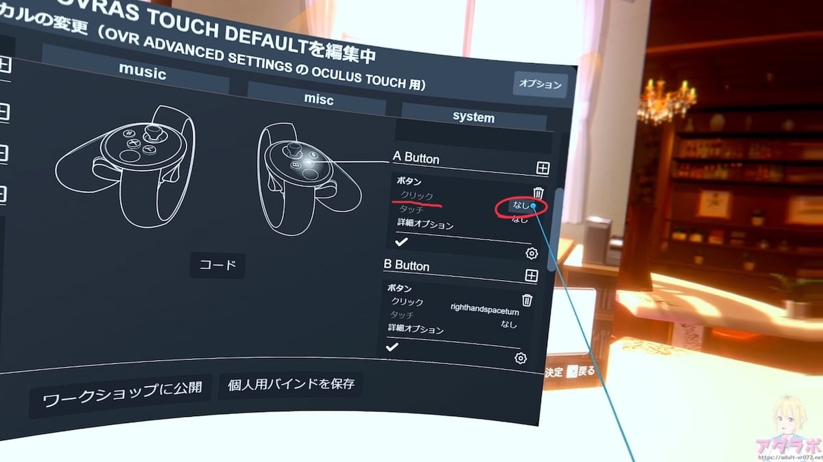 画像はAボタンに機能追加した時のもの。このようにクリックやタップの部分に「なし」と表記されているので、クリックの隣の「なし」の部分を選択します。