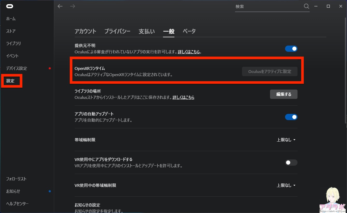 →PC版アプリでOculusをアクティブにする