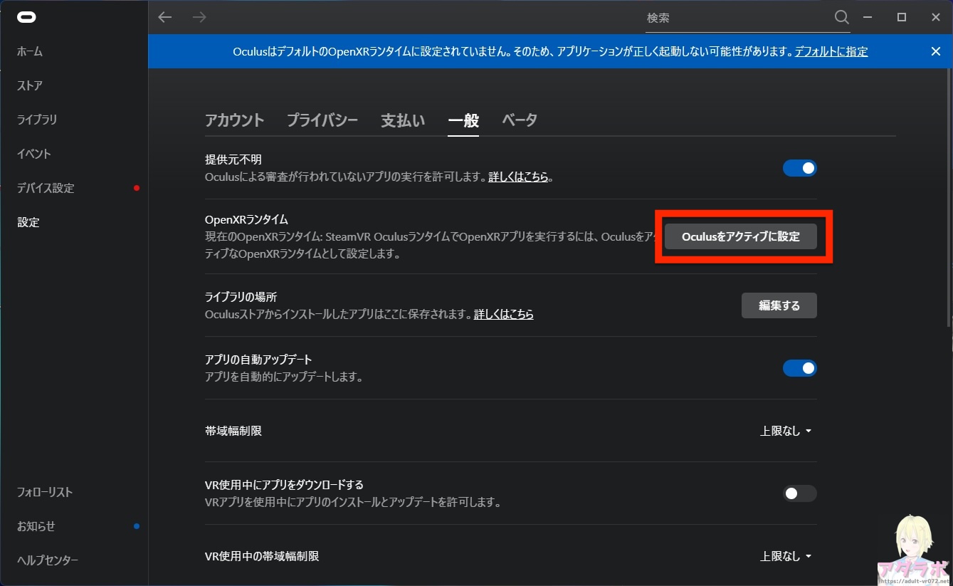 Oculusがアクティブに設定されていない時はPC版Oculusアプリにこのような青色の背景で警告が出ます。Meta QuestでPCVRするときはとりあえず「Oculusをアクティブに設定」ボタンを押しておきましょう。