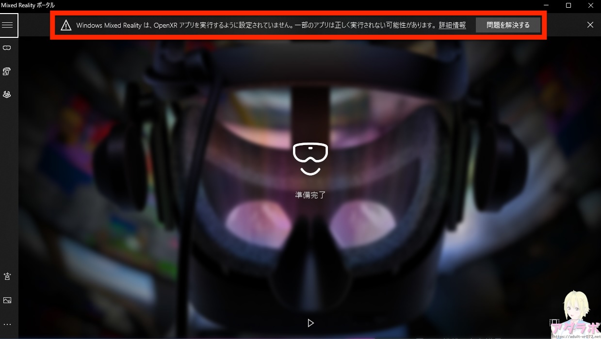 例えばOculusがアクティブなランタイムになっている時、WindowsMRを起動するとこのように警告が出ます。これで「問題を解決する」をクリックするとWindowsMRがアクティブなランタイムに切り替わります。