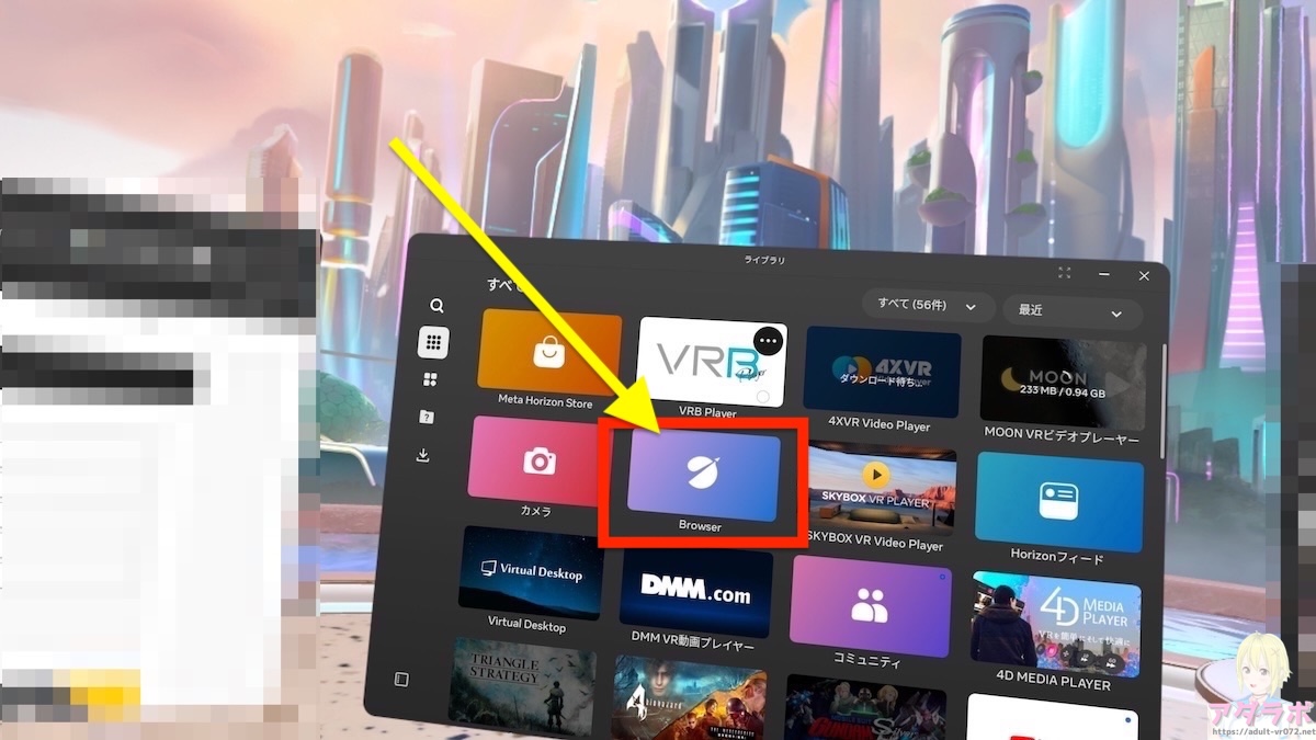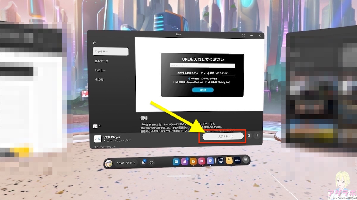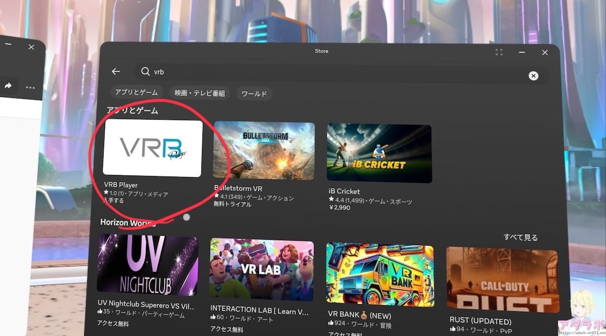 Meta Storeで「VRB Player」を検索すると専用のプレイヤーが出てきます。こちらをインストールした上でMeta Questの「ブラウザ」アプリからTSUTAYA DISCASに行くと動画を視聴することができます。