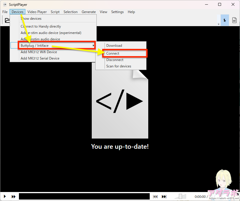 続いてScriptPlayerのメニューから「Devices」→「Buttplug / Intiface」→「Connect」を選択。これでIntiface Centralとの連携が完了します。