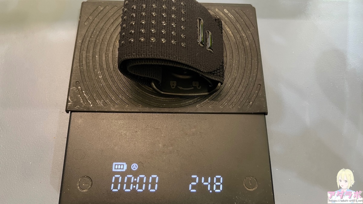 続いて重さを調べてみました。The Handy2 Pro本体の重さは802.4g、専用オナホールの重さは129.5g、バンドの重さは24.8gとなりました。もし全部装着したら956.7gになります。